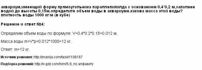 Аквариум, имеющий форму прямоугольного параллелепипеда с основанием 0,4*0,2м, заполнен водой до высоты 0,15. Определите объем воды в аквариуме. Какова масса этой воды? Плотность воды 1000кг/м в кубе