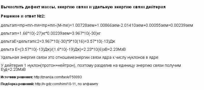 Главная / Подборки ГДЗ и решения по физике / Гдз и решения по физике за 5, 6, 7, 8, 9 классы / Вычислить дефект массы, энергию связи и удельную энергию связи атома дейтерия
