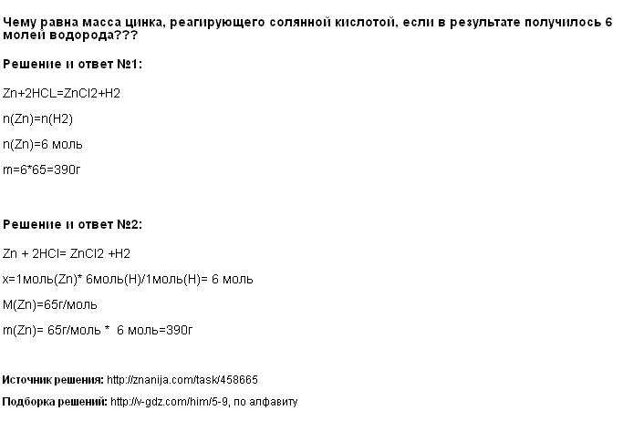 Чему равна масса цинка, реагирующего с соляной кислотой, если в результате реакции получилось 6 молей водорода?