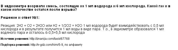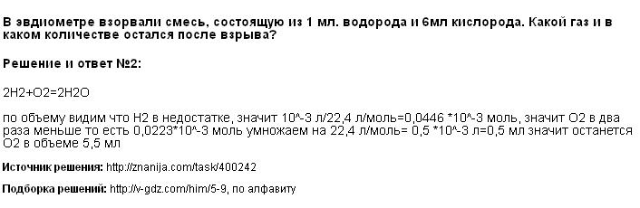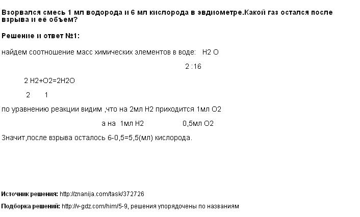 В эвдиометре взорвали смесь, состоящую из 1 мл водорода и 6 мл кислорода. Какой газ и в каком количестве остался после взрыва?