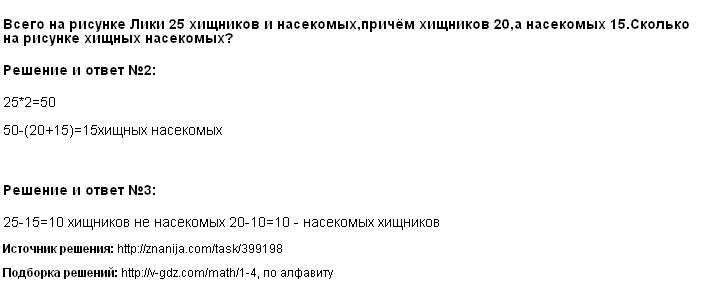Всего на рисунке Лики 25 хищников и насекомых, причём хищников 20, а насекомых 15, Сколько на рисунке хищных насекомых?
