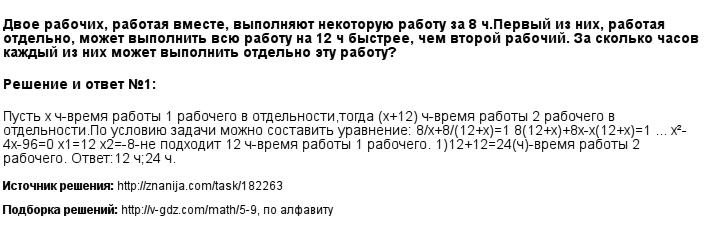 Двое рабочих, работая вместе, выполняют некоторую работу за 8 часов. Первый из них, работая отдельно, может выполнить всю работу на 12 часов быстрее. За сколько часов каждый из них, работая отдельно, может выполнить работу?