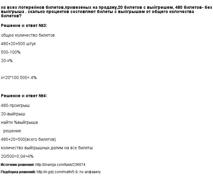 Из всех лотерейных билетов, привезенных на продажу, 20 билетов с выигрышем, а 480 билетов - без выигрыша. Сколько процентов составляют билеты с выигрышем от общего количества билетов?