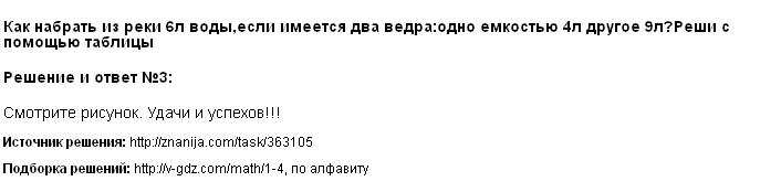 Главная / Подборки ГДЗ и решения по математике и алгебре / Гдз и решения по математике и алгебре за 5, 6, 7, 8, 9 классы / Как набрать из реки ровно 6 л воды, если имеются два ведра: одно ёмкостью 4 л, другое 9 л?
