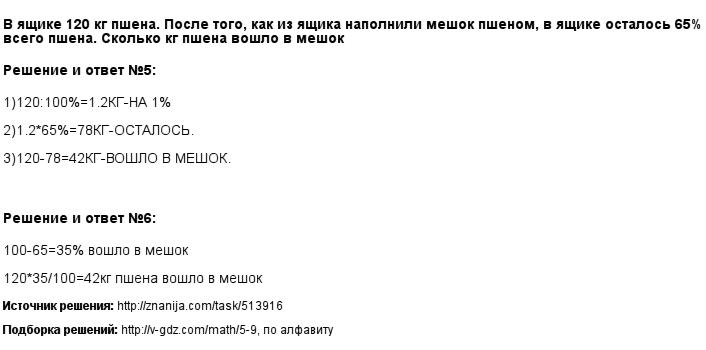 В ящике 120 кг пшена. После того как из ящика наполнили мешок пшеном, в ящике осталось 65 % всего пшена. Сколько килограммов пшена вошло в мешок?