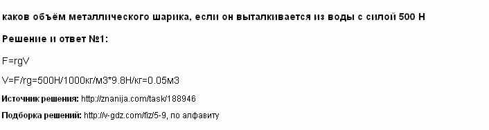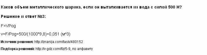 Каков объем металлического шарика, если он выталкивается из воды с силой 500 Н?