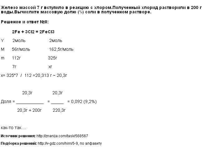 Железо массой 7 г вступило в реакцию с хлором. Полученный хлорид растворили в 200 г воды. Вычислите массовую долю (%) соли в полученном растворе.