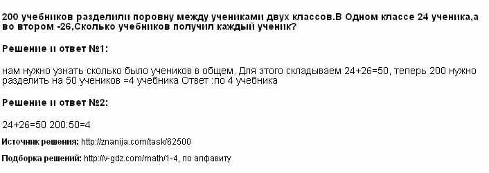200 учебников разделили поровну между учениками двух классов. В одном классе 24 ученика, а во втором - 26. Сколько учебников получил каждый ученик?