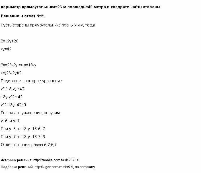 Главная / Подборки ГДЗ и решения по математике и алгебре / Гдз и решения по математике и алгебре за 5, 6, 7, 8, 9 классы / Периметр прямоугольника 26 м, площадь 42 м^2. Найти стороны прямоугольника.