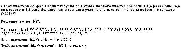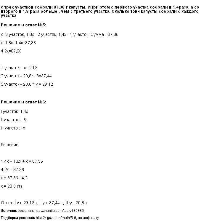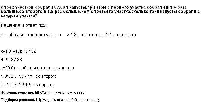 С 3 участков собрали 87,36 т капусты. При этом в первого участка собрали в 1,4 раза больше, а со второго в 1,8 больше, чем с третьего участка. Сколько тонн капусты собрали с каждого участка?