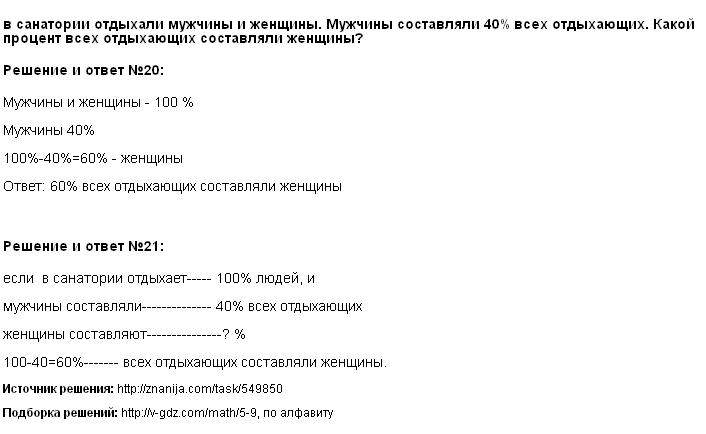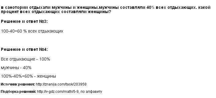 В санатории отдыхали мужчины и женщины. Мужчины составляли 40% всех отдыхающих. Какой процент отдыхающих составляли женщины?