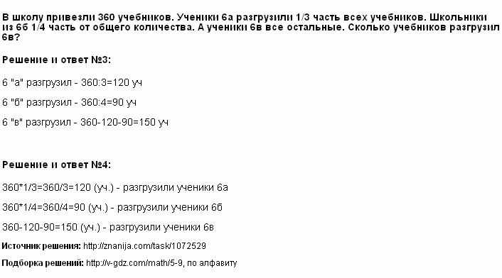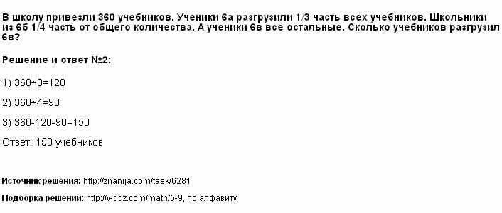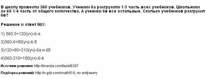 В школу привезли 360 учебников. Ученики 6а разгрузили 1/3 часть всех учебников. Школьники из 6б 1/4 часть от общего количества. А ученики 6в все остальные. Сколько учебников разгрузил 6в?